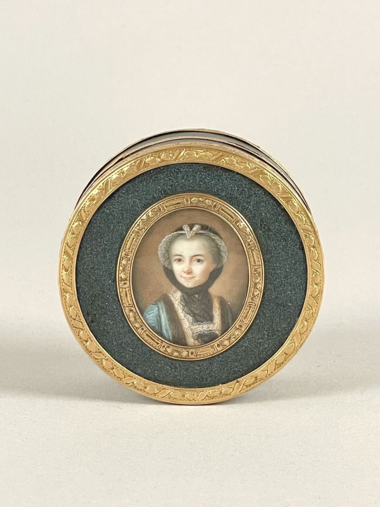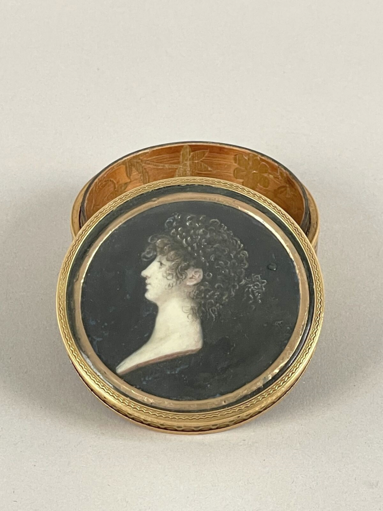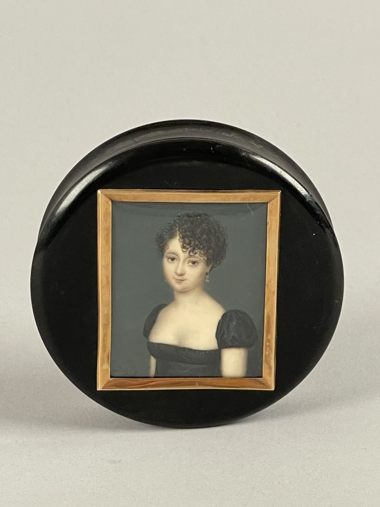 Boîte ronde en composition d’écaille de tortue brune,le couvercle orné d’une miniature rectangulaire sur ivoire représentant une jeune femme à mi-corps de trois-quarts à gauche en robe noire.