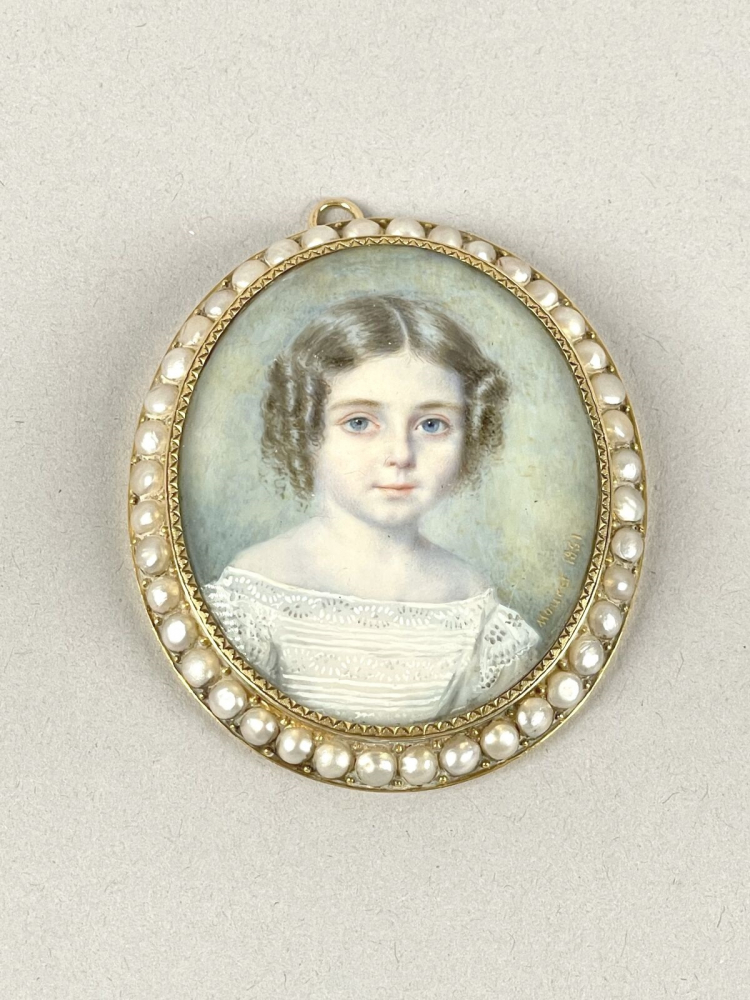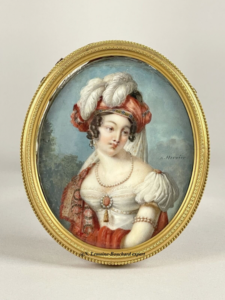 Miniatures n° 49 à 89, notamment n° 73 par Louis-Léopold BOILLY, José OTHON, N° 85 Claude BELIN Jeune fille 1794, est. 600-800 € (repr. ci-dessus), N° 79 John Jules NIMMO, Madame DELAISTRE, n° 69 par DAGOTY, Attr à BOURGEOIS, par A. HERVIER, rare miniature en grisaille du CHEVALIER DE VAULT (actif en 1738);Catherine Mathilde VILLOUTREIX; Achille MOURET; collection de boîtes à miniatures, etc.