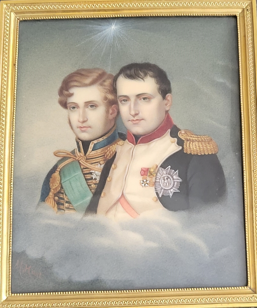 L’empereur Napoléon et son fils, duc de Reichstadt, presque déifiés dans des nuées sous une étoile brillante perçant les nuages, vers 1920