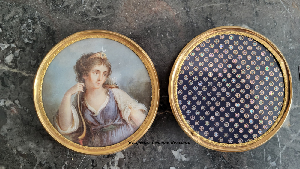 n° 6. Ecole française de la première moitié du XIXe siècle - Diane chasseresse, Miniature sur ivoire, diamètre à vue : 7,2 cm sur le couvercle d'une boîte en écaille montée en or et en partie en métal doré, la bâte et la base ornées de pastilles de burgau multicolores sur fond émaillé bleu sombre. Poinçons : tête d'homme et coq sur la monture (petits chocs, petit manque à la bâte du couvercle, monture à refixer) A l'intérieur une étiquette de collection à fond noir : 207 D. : 8,3 cm, H. : 2,6 cm Poids total : 100 g. Est. 300-500 €, vendue 1235 € (repr. ci-contre).