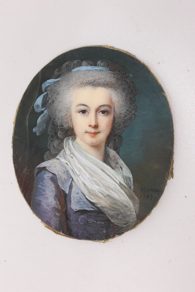 Belle vente de printemps. Miniatures n° 731 à 746 à prix attractifs, et avec leur certificat Cites pour celles sur ivoire, permettant la libre circulation dans l'Union européenne. Dont: n° 740, paire de portrait par L. de GOYON, n° 741, rare émail par DUPUY 1812, n° 742 Jeune femme signée par JL MOSNIER (repr. ci-dessus), est. 300-400 €, n° 744, Général époque révolutionnaire, n° 746 dans l'esprit de Gaspard GOBAUT (1814-1882) "Occupation de l'Ile de Lobau le 4 juillet 1809 préfigurant la bataille de Wagram 6 juillet 1809", 6,3 x 7,7 cm, Est.: 350-380 €