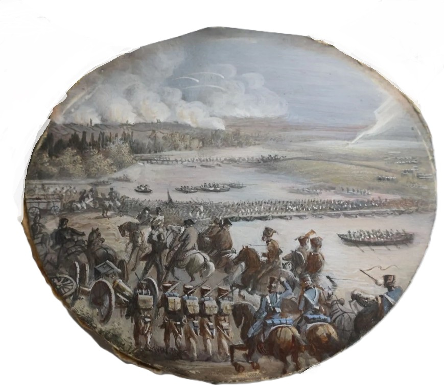 "Occupation de l'Ile de Lobau le 4 juillet 1809 préfigurant la bataille de Wagram 6 juillet 1809" Miniature à la gouache et aquarelle sur papier ou carton, dans un camaïeu de gris et bruns relevé de quelques touches de bleu. XIXe siècle. Ancienne attribution à HJ van Blarenberghe avec identification du sujet au verso 63 x 77 mm dans un cadre en bois noirci 12,5 x 14,5 cm.