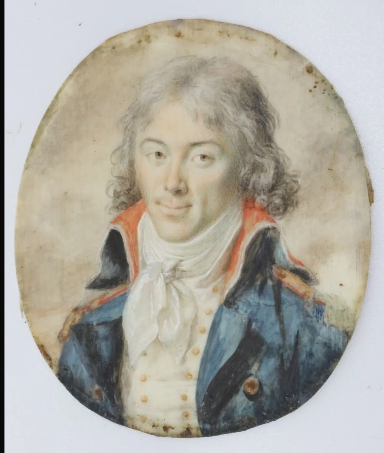 Officier général époque Révolution/Directoire, en uniforme, en buste de trois-quarts à gauche. Miniature sur ivoire ovale, 6,1 x 5,2 cm Cadre postérieur rect. en bois noirci 12.2 x 11 cm