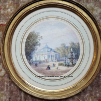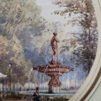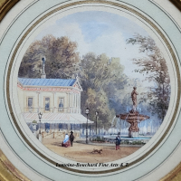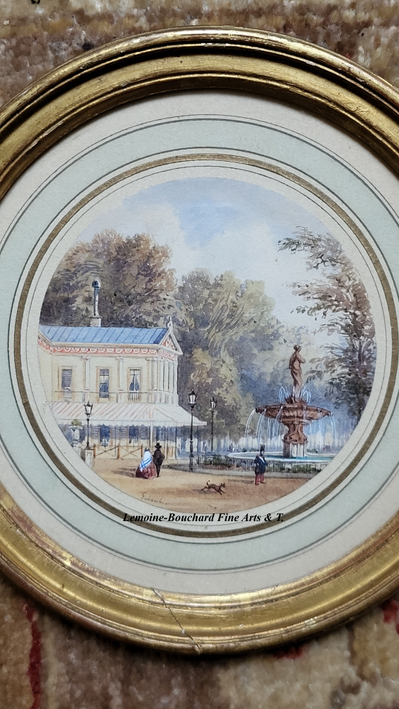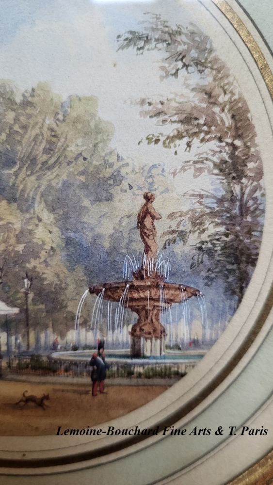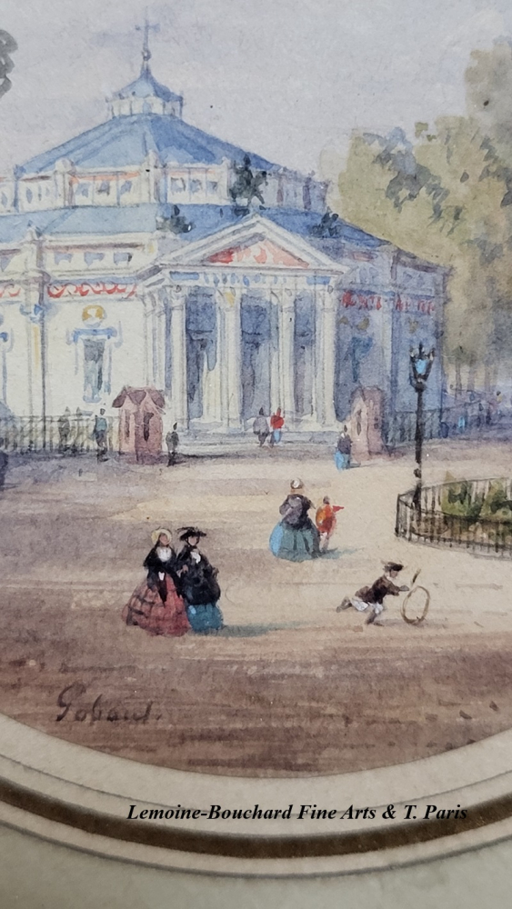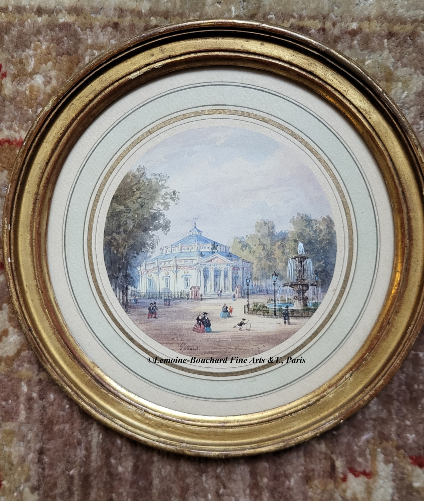 Fine Watercoloours by Miniature painter Gaspard Gobaut (1814-1882). These two views are taken from the gardens of the Champs-Elysées, on the north side, in two prominent locations of Parisian life. One can see the Café-Concert des Ambassadeurs, built in 1772, on Avenue Gabriel along the edge of the Champs-Elysées, with the Venus fountain, designed by architect Jacques Hittorf, on the right. And the Cirque d’Eté, built in 1843 (later became the Cirque de l’Impératrice under the Second Empire).