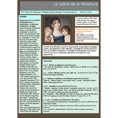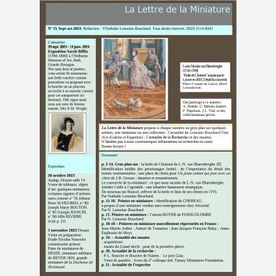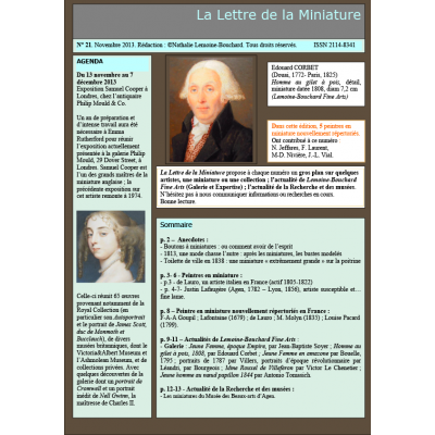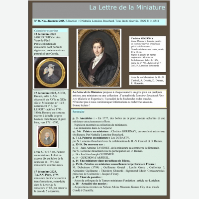 If you want to receive La lettre de la miniature , a periodical digital magazine dedicated to Miniature painting that gives (in French) the news on Study and Research on 17th-19th Century Miniature paintings and painters, Museums' activity in this field and collections, Lemoine-Bouchard Fine Arts's news (Galery and expertise), Participation Fee is 50 euros TTC for year 2025 (n° 81-86). Archives can been purchase (10 € per issue). Please contact by email, payment by banktransfer only.