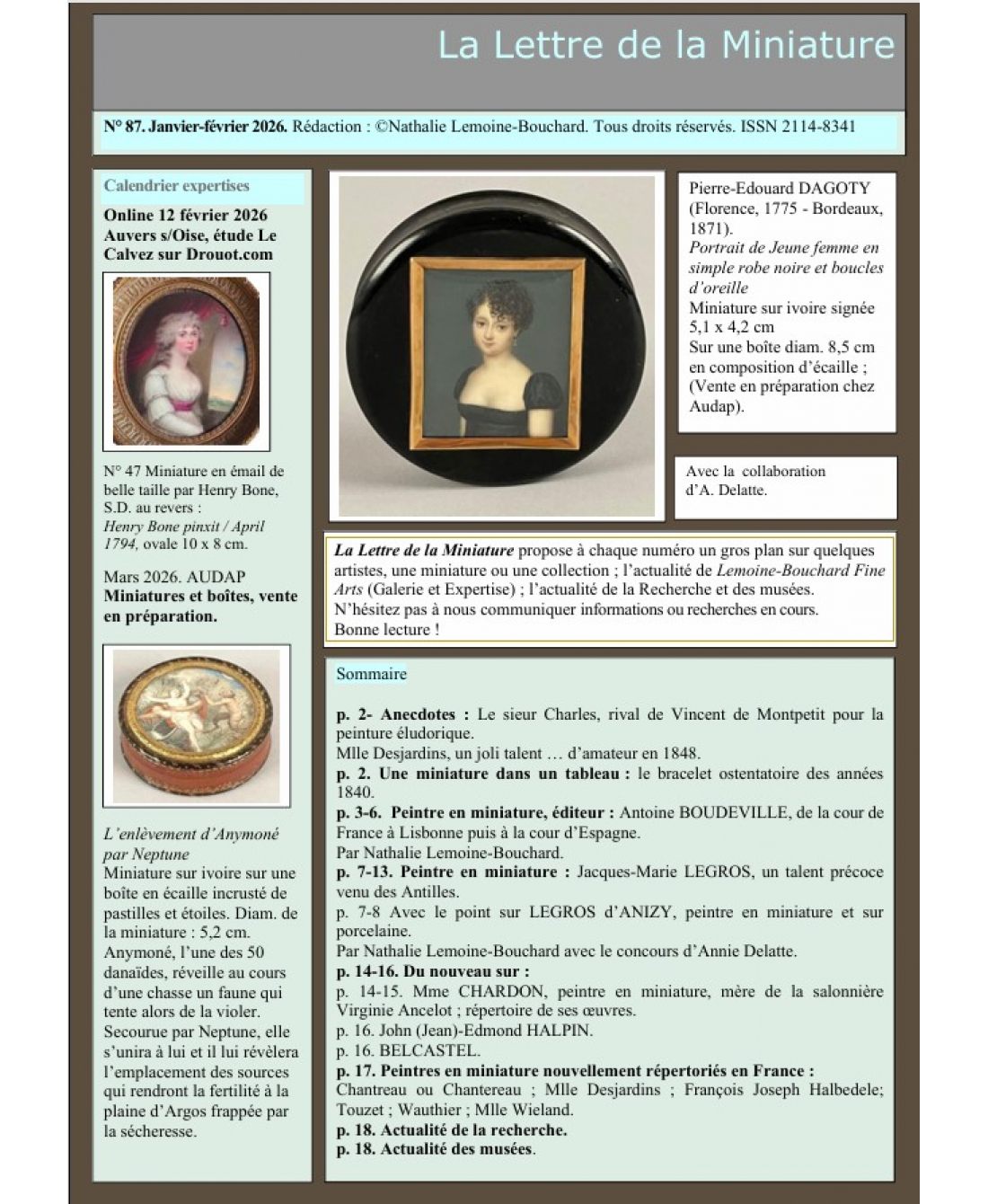 p. 7-8 Avec le point sur LEGROS d’ANIZY, peintre en miniature et sur porcelaine. Par Nathalie Lemoine-Bouchard avec le concours d’Annie Delatte.